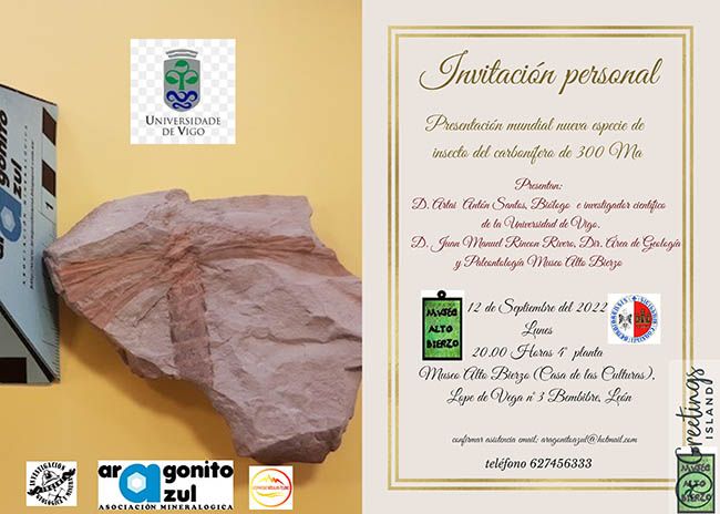 Un descubrimiento histórico se ha producido en el Bierzo. Tanto es así, que la Asociación Mineralógica y Cultural Aragonito Azul y en su nombre, Juan Manuel Rincón Rivero, director del Área de Geología y Paleontología del Museo Alto Bierzo, junto con la Concejalía de Cultura, Fiestas, Turismo y Comercio, fechan el próximo 12 de septiembre, para la presentación mundial de la nueva especie de insecto del Carbonífero, que cuenta con 300 Ma de antigüedad.