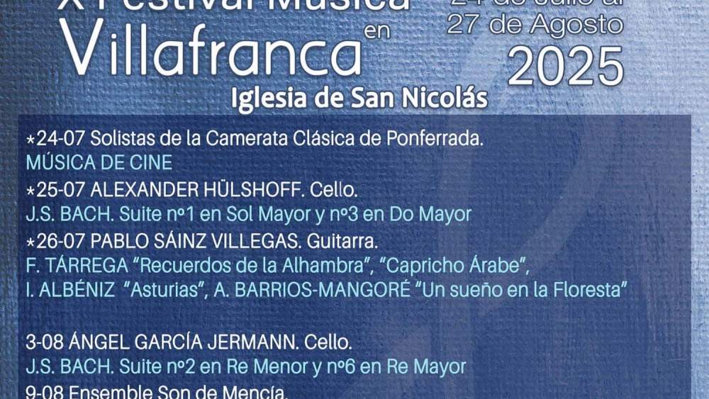 La “Sinfonía n.º 5” de Beethoven, la “Obertura Española n.º 2”, de Mijaíl Glinka y el “Adagio” de Pedro Halffter, serán las obras protagonistas del concierto que el grupo berciano de música de cámara El Ensemble Son de Mencía dará este sábado, 9 de agosto, a las 20:30 horas en la Iglesia de San Nicolás de Villafranca, con motivo de la celebración de la quinta jornada de la décima edición del Festival 'Música en Villafranca', cuya entrada tiene un precio de 15 euros y se puede obtener mediante reserva a través del teléfono 682395967 o en la propia iglesia antes de que inicie el evento, según ha informado la organización del festival en un comunicado.