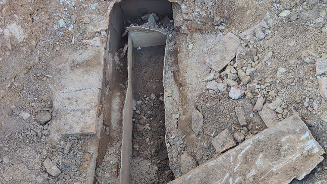 Algunos de los ladrillos utilizados en la estructura presentan decoraciones digitales impresas, entre las que se identifican círculos concéntricos bien marcados y, en otros casos, aspas. Este tipo de motivos, aunque sencillos, aportan información valiosa sobre las técnicas constructivas y las prácticas simbólicas en el ámbito funerario romano.