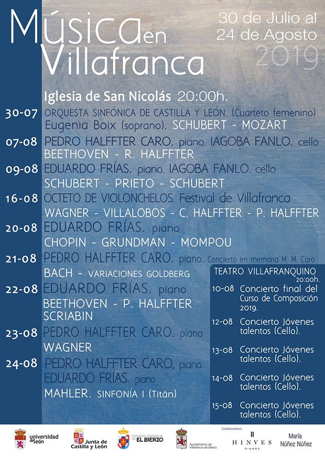 El ciclo Música en Villafranca arrancó el pasado 30 de julio con el recital 'Música en el Camino', del Ensemble de cuerdas de la Orquesta Sinfónica de Castilla y León (Oscyl). A lo largo del mes de agosto, el programa ofrecerá otros siete conciertos, de la mano de Halffter y Fanlo, a los que también acompañará el pianista Eduardo Frías. Además, el Teatro Enrique Gil y Carrasco acogerá otros cinco recitales a cargo de los jóvenes participantes en el curso de composición Cristóbal Halffter, que se celebra en la villa del Burbia.