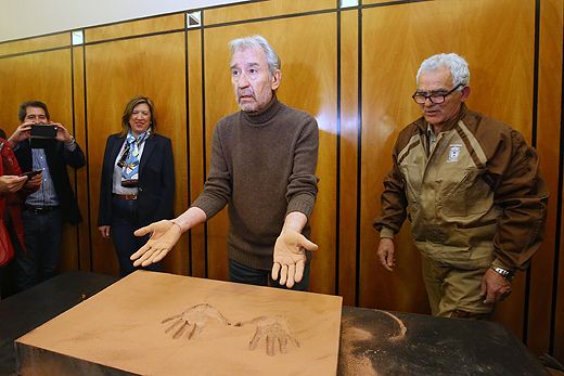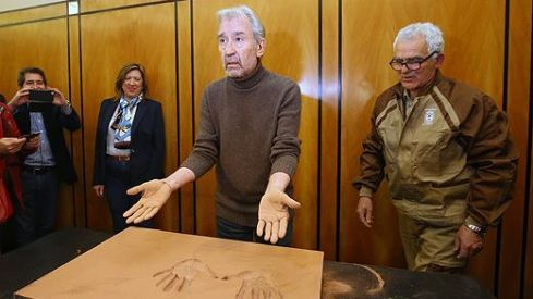 20161215_035 El actor José Sacristán imprime sus manos en la baldosa para la acera del Teatro Bergidum de Ponferrada / César Sánchez / ICAL