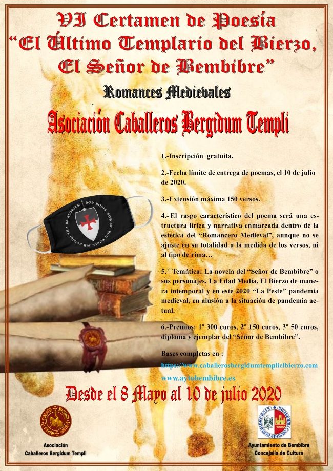 La Asociación de Caballeros Bergidum Templi, en colaboración con la Concejalía de Cultura del Ayuntamiento de Bembibre, ha convocado la VI edición de su Certamen de Poesía, aunque este año no habrá acto de imposición de capa por la crisis del COVID-19. Este certamen rinde homenaje al “último templario del Bierzo, el Señor de Bembibre” y busca premiar los mejores romances medievales con motivo del aniversario del nacimiento de Enrique Gil y Carrasco.