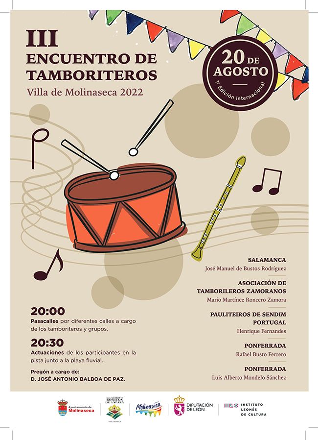 El próximo sábado 20 de agosto, tendrá lugar la tercera edición del encuentro de tamboriteros con música y baile tradicional. A las 20:00 horas comienza el pasacalles de los Tamboriteros participantes en el encuentro, y a las 20:30 horas dará comienzo de manera oficial el III Encuentro de Tamboriteros. El pregonero será José Antonio Balboa de Paz, historiador y escritor.