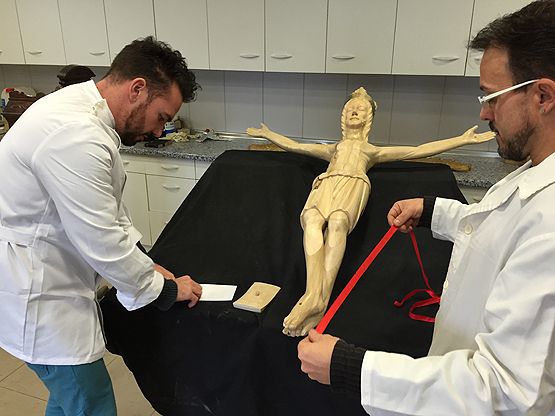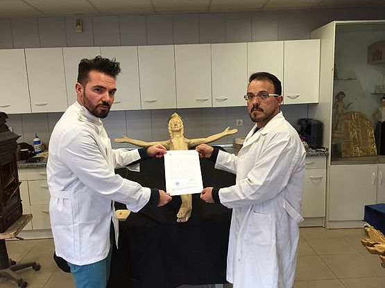 La Hermandad de Jesús Nazareno ha entregado a los talllistas que realizan la réplica del Cristo templario de la Fortaleza o de las Maravillas Muerto el documento con los nombres de los sufragadores que con sus donaciones han ayudado a hacer posible esta obra.