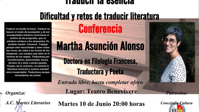 La Primera Semana Cultural que organiza la Asociación Cultural Martes Literarios de Bembibre comienza el martes 10 de junio con la charla titulada ‘Traducir la esencia’ que impartirá Martha Asunción Alonso a partir de las ocho de la tarde en el Teatro Benevivere de la localidad berciana.