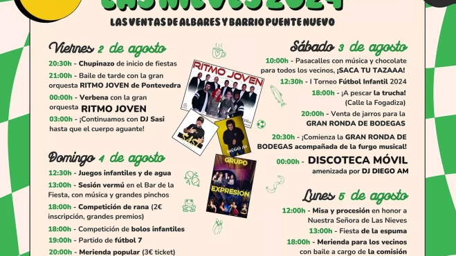 Orquesta Ritmo Joven, Grupo Expresión, ronda de bodegas, DJs hasta la madrugada, meriendas populares, I Torneo de Futbol Infantil, pesca de la trucha y mucho más. Un cartel muy completo que se podrá disfrutar los días 2, 3, 4 y 5 de agosto en Las Ventas de Albares, celebrando la festividad de La Virgen de Las Nieves.