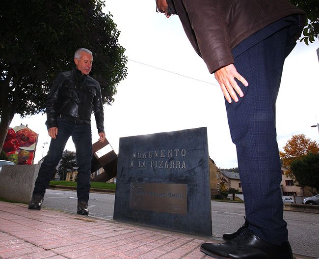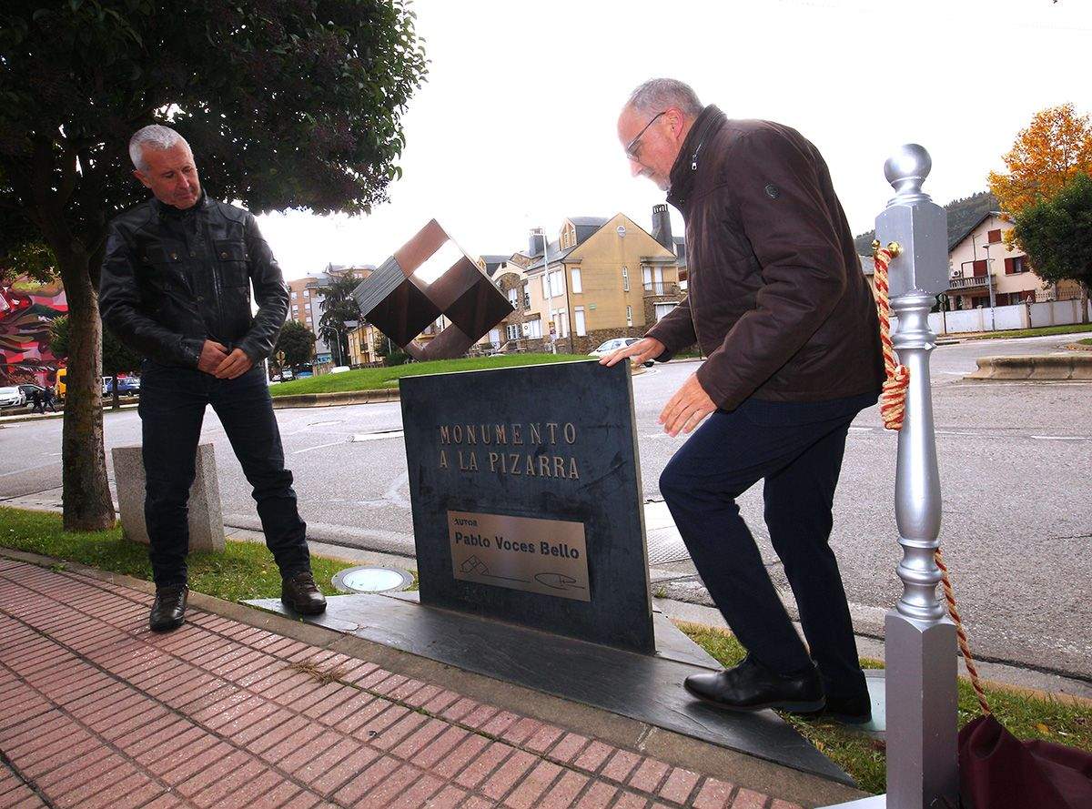 El alcalde de Ponferrada, Olegario Ramón (D), descubre una placa en memoria del escultor Pablo Voces (I)