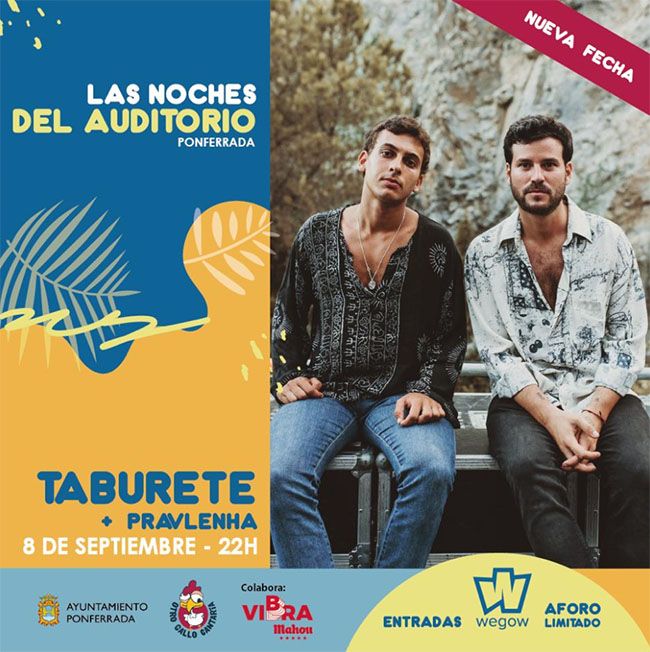 Por su parte, el concierto de Taburete estaba previsto inicialmente para el pasado 15 de julio, pero se pospuso por la enfermedad de uno de los miembros de la banda. La nueva fecha será el miércoles 8 de septiembre y el precio de la entrada es de 25 euros. Además, contarán con el berciano Pravlenha como telonero. Puedes adquirir tu entrada para Taburete en este enlace (CLIC).