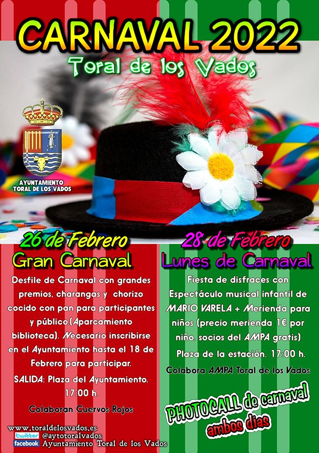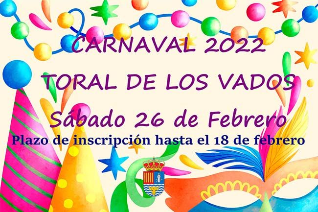 El Ayuntamiento de Toral de los Vados confirmaba que el sábado día 26 de febrero se celebrará el Carnaval 2022 con desfile, premios y más sorpresas "si las condiciones sanitarias lo permiten". Sin embargo, este 24 de febrero la Casa Consistorial del municipio ha realizado una modificación: "Os informamos que todas las actividades previstas para el sábado 28 de febrero con motivo del carnaval 2022 tendrán lugar en la plaza del Ayuntamiento. Salida del desfile de Carnaval. Reparto de chorizos cocidos, entrega de premios y photocall".