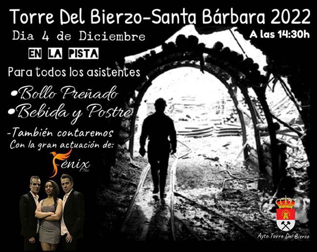 Las celebraciones por Santa Bárbara en El Bierzo vuelven un año más. Concretamente, la localidad minera de Torre del Bierzo llevará a cabo sus festividades el 4 de diciembre, en la pista municipal. Para todos los asistentes habrá bollo preñado y bebida y postre. Además, será el trío Fénix el encargado de dar ritmo a la jornada festiva.
