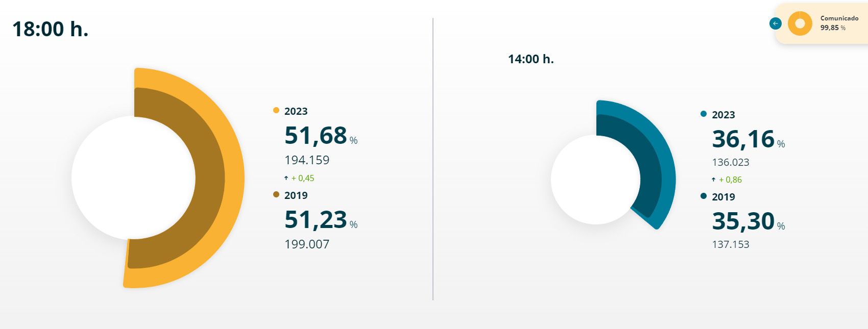 En Villafranca del Bierzo la participación a las 18 horas es del 53,37%% , una subida de casi 3 puntos, con respecto a los comicios de 2019, cuando a esta hora era del 51,00%. En cuanto a votos, este 2023 se contabilizan 1.312 votos frente a los 1.350 de hace 4 años