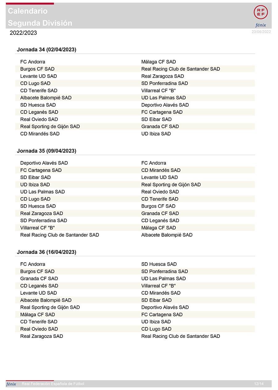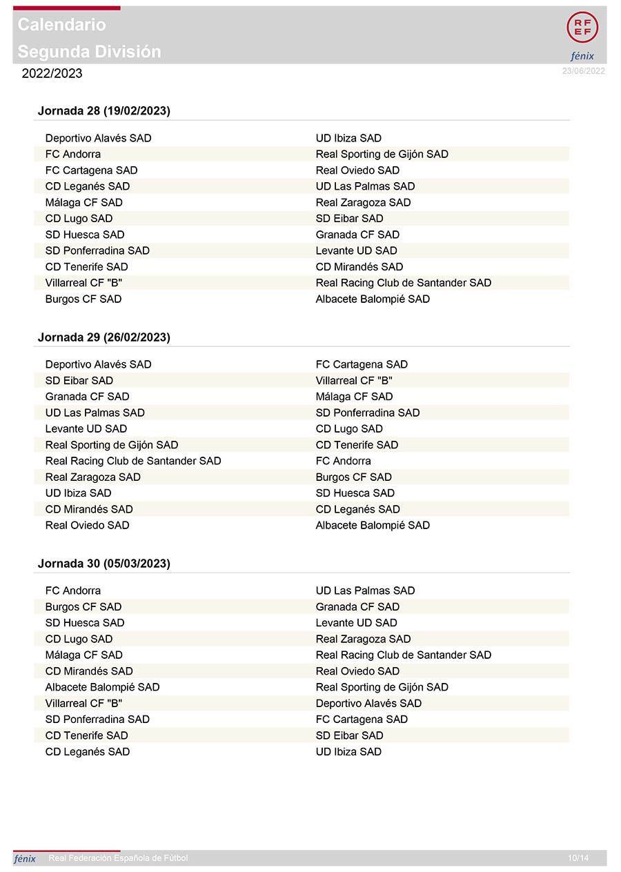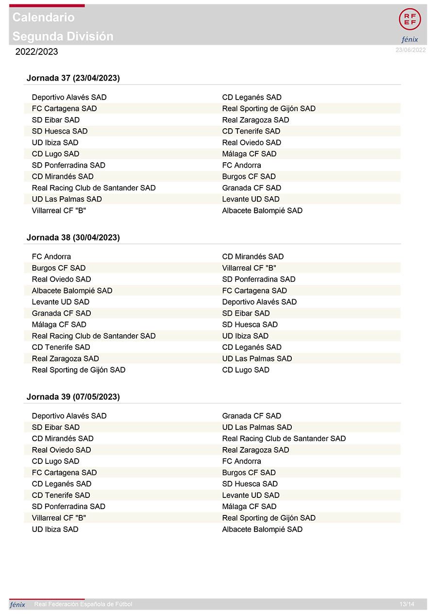 La segunda vuelta comienza en El Toralín contra el filial del Villarreal en el primer partido del 2023, el 8 de enero, antes de enlazar tres duelos complicados frente a Tenerife (14 de enero), Eibar (22 de enero) y Zaragoza (29 de enero). El Racing de Santander visitará El Toralín el 5 de febrero, una semana antes de viajar a Ibiza (12 de febrero). Levante (19 de febrero) y Las Palmas (26 de febrero) serán los siguientes rivales antes de recibir al Cartagena en la 30ª jornada, el 5 de marzo. Dos recién descendidos, Alavés (19 de marzo) y Granada (13 de marzo), serán los siguientes rivales antes de que el Mirandés visite el Toralín en la 33ª jornada, el 26 de marzo.