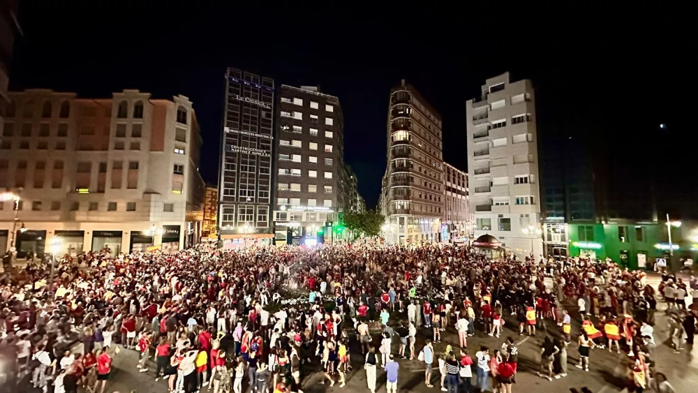En cuestión de minutos, el centro de la capital berciana 'se tiñó' de rojo con banderas, camisetas y colores que celebran la cuarta Eurocopa de la Selección Española Masculina de Fútbol que ha sido posible gracias a los goles de Nico Williams en el minuto 47 y de Nico Williams en el 86 que hicieron 'explotar' el Casco Antiguo de la capital berciana.