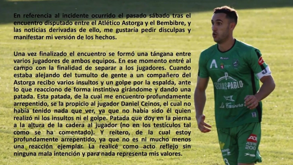 Por otro lado, describe su actuación «como acto reflejo, sin mala intención» y, como muestra de ello, asegura que el domingo por la tarde se puso en contacto con el jugador afectado para pedirle disculpas por lo ocurrido en ese momento, al final del choque, y preocuparse «por su estado de salud». Por este motivo, remata su comunicado, quiere «pedir disculpas públicamente al jugador Dani Ceinos y a las aficiones del Atlético Astorga y Atlético Bembibre por los hechos sucedidos».