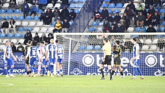 El zaguero blanquiazul fue expulsado tras una acción con Amin, delantero del Ourense, en la que le dejó la pierna en la rodilla del atacante marroquí después de una posible falta de este último. Finalmente, tras la revisión en el Football Video Support (FVS), el colegiado decretó su expulsión, según el acta, por «producirse de manera violenta al margen del juego, no estando en posibilidad de disputar el balón o el juego detenido».