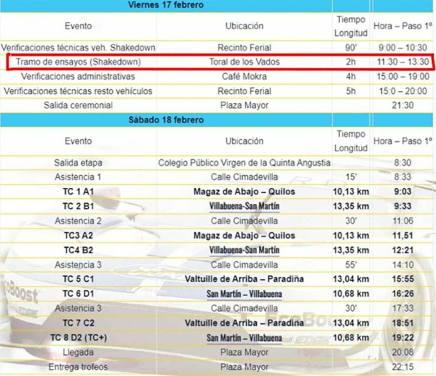 Una prueba que contará con dos partes, el viernes 17 de febrero tendrán lugar las verificaciones técnicas en el Recinto Ferial entre las 09:00 horas y las 10:30 horas. Entre las 11:30 y las 13:30, se efectuará el Tramo de ensayos (shakedown), las verificaciones administrativas, en el Café Mokra, entre las 15:00 horas y las 19:00 horas, las verificaciones técnicas en el Recinto Ferial entre las 15:00 horas y las 20:000 horas, para finalmente celebrar la salida ceremonial a las 21:30 horas desde la Plaza Mayor de Cacabelos.