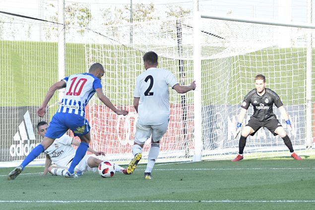 El inicio del choque ofreció mucha igualdad, con ambos conjuntos tratando de cercar en parte el área rival. La mejor ocasión visitante, en el minuto 20, la protagonizó Yuri, que aprovechó un error de la defensa madridista para recoger el balón y firmar una vaselina que obligó a Luca a realizar una estirada prodigiosa para evitar que los blanquiazules se adelantaran en el marcador.