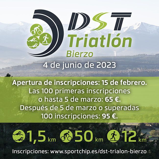 Para formalizar la inscripción, limitada a 300 participantes, hay que enviar un correo a inscripciones@sporthip.es. El plazo comenzó el 15 de febrero y hubo una oferta hasta el 5 de marzo por 65 euros, aunque una vez superadas las 100 inscripciones el coste de la inscripción asciende a 95. La información sobre la prueba está disponible en dos páginas web: https://www.sportchip.es/dst-triatlon-bierzo/ https://www.dstgroup.es/dstsportcenter/triatlon-bierzo/ .