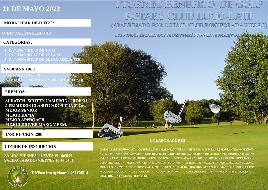 El torneo Rotary-Lugo organizado por el Club de Golf de Lugo y Club Rotary Ponferrada-Bierzo, tendrá un fondo solidario destinando toda su recaudación a los refugiados por la Guerra de Ucrania. Será el próximo 21 de mayo en la localidad gallega. Tendrá un precio de inscripción 20 euros y será bajo la modalidad Individual Stableford.