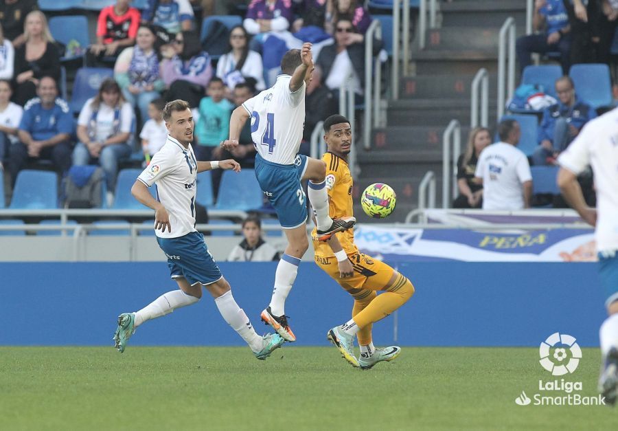 Remate fallado por Jérémy Mellot (Tenerife) con la derecha desde fuera del área que se le va demasiado alto tras un saque de esquina.