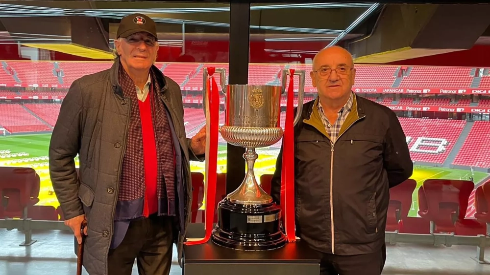 Marianín, histórico futbolista conocido como “El jabalí del Bierzo”, visitó este martes San Mamés, el estadio del Athletic Club de Bilbao, donde posó junto a otra leyenda del fútbol español, José Ángel Iribar, y la Copa del Rey cosechada recientemente por el conjunto vasco después de imponerse en la tanda de penaltis (4-2) al Mallorca en un partido cuya prórroga había acabado 1-1.