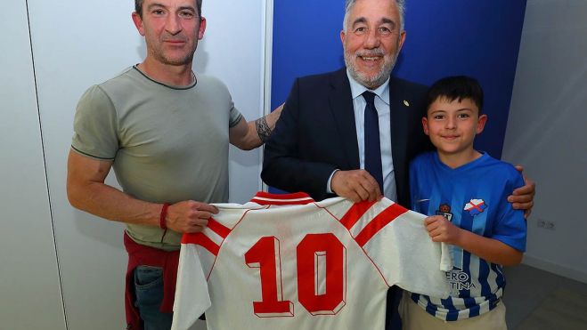 La camiseta ha sido cedida por el ex jugador de la Deportiva José Antonio Pérez, que la conserva desde su etapa en Ponferrada. El recorrido de la equipación con el emblemático 10 de Maradona tiene su historia. Vicente Miera, por entonces en el organigrama sevillista, se la entregó a Lisardo Rodríguez, directivo blanquiazul, en el partido del Sánchez Pizjuán para que se la hiciese llegar a su amigo Nino Cubelos.