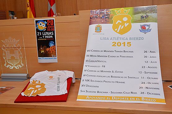 El concejal de deportes, (2º por la drcha.) y algunos de los organizadores de la Liga. Foto: Víctor Alón.La Liga Atlética del Bierzo ya tiene listo su calendario de carreras deportivas para este 2015. El concejal de Deportes, Sergio Gallardo, presentó este martes las fechas de las pruebas que acoge esta iniciativa del Ayuntamiento de Ponferrada que, una vez más, cuenta con varias novedades, entre las que destaca la entrega de premios que ascienden a 2.500 euros.