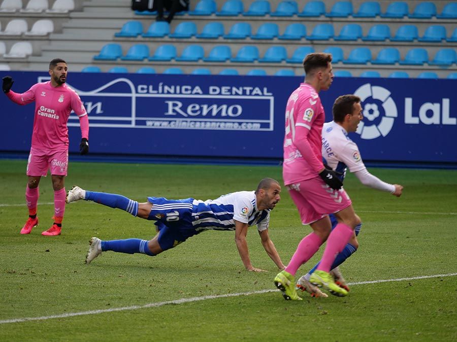 Aunque no estuvo lo bien que se podía esperar después de los últimos encuentros, estuvo a punto la Deportiva de adelantarse si Curro hubiera logrado sorprender a Álex con un zurdazo que repelió el arquero visitante. El propio portero tuvo que intervenir para evitar que su compañero Athuman pusiera el 1-0 con un remate desafortunado hacia su propia portería. Desde el costado izquierdo lo intentaron Doncel y Ríos Reina, pero sus disparos se encontraron con el mismo destino que sus compañeros: el muro de Álex Domínguez.