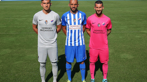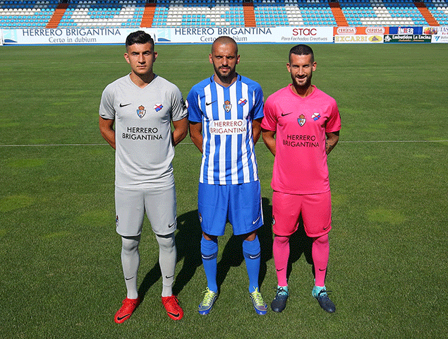 Los logos de Herrero Brigantina, que continúa como patrocinador principal del equipo, aparecen en la parte delantera y en una de las mangas. La otra está reservada para el logotipo oficial de la Segunda División B. También se mantiene el protagonismo en las camisetas y pantalones de Valcarce y Caja Rural.