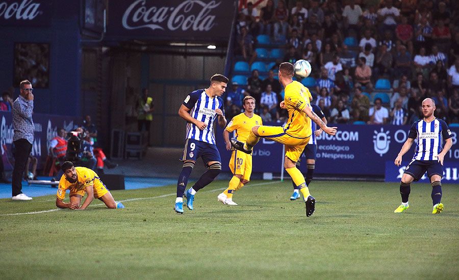 Quizá mentalmente exigidos por la superioridad numérica, los de Bolo buscaron la portería con menos orden del necesario. Ni Yuri ni Asier Benito, sin embargo, fueron capaces de marcar en las acciones más cercanas al gol. Russo también perdonó en una jugada de Son por la derecha. Desde la misma banda llegó la mejor ocasión, con un remate de Bravo de cabeza que obligó a Jiménez a realizar una intervención superlativa. Asier Benito remató flojo y al centro en la última aproximación de los blanquiazules, que no pudieron romper el 1-1.