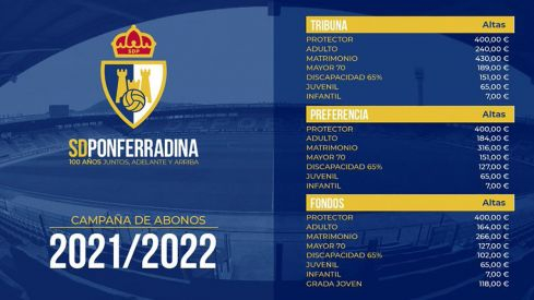 Para los nuevos socios, los precios del abono van desde los 65 euros del carné juvenil hasta los 400 del protector. El carné de adulto costará 164 euros en los fondos, 184 en Preferencia y 240 en Tribuna. Estos precios se mantendrán sin modificaciones para la siguiente campaña, la 2022-2023, con independencia de la categoría en la que esté el equipo.