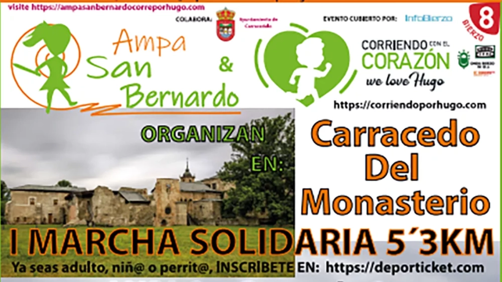 Andarines de distintas provincias de España junto a paseantes solidarios del Bierzo caminarán juntos en la I Marcha Solidaria, organizada por el AMPA del colegio San Bernardo de Carracedo en favor de la asociación de enfermedades raras 'Corriendo con el corazón de Hugo'. La marcha tendrá lugar este sábado, 25 de mayo, con salida a las 11:00 horas y se hará por los alrededores de Carracedo del Monasterio y es apta para todos los públicos con una distancia de 5,3 kilómetros.