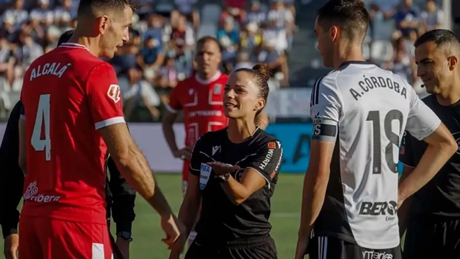 Después de veinte años en el arbitraje, esta colegiada de 34 años, que llevaba varias temporadas en Primera RFEF y Liga F, tuvo su premio en un partido en el que estuvo acompañada en la designación por Carrero Cabrera y Fullá Planas como asistentes, Etayo Herrera como cuarto árbitro y en el VAR, González Francés. Tuvo bastante trabajo, ya que tuvo que mostrar siete tarjetas y los primeros goles tuvieron polémica.