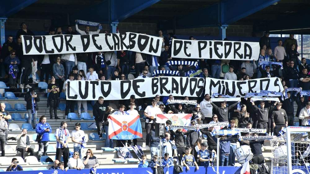 Además, la grada local ha querido realizar su propio homenaje con una pancarta que esgrimaba "Dolor de carbón de piedra. Luto de bravos mineros". Un recordatorio a los mineros de Laciana y El Bierzo que ya fueron despedidos en sus respectivas localidades.