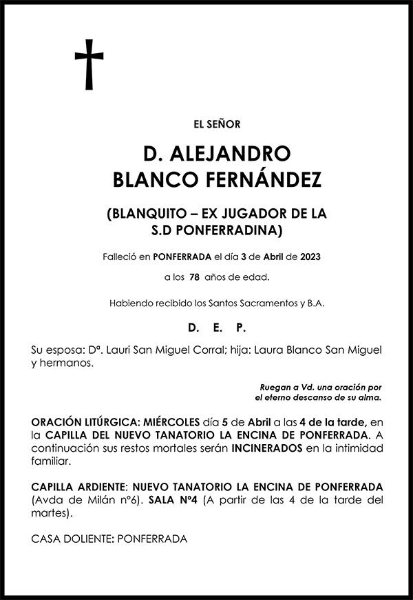 Alejandro Blanco, que fue jugador de la Deportiva Ponferradina, nos ha dejado a los 78 edad. Casado con Lauri San Miguel y padre de Laura, con su pérdida nos deja una parte del club blanquiazul, un jugador muy querido y recordado por la afición a pesar de que sólo estuvo dos temporadas, la 66-67 y la 71-72, en el equipo berciano.