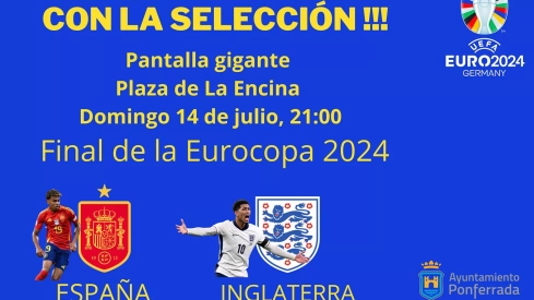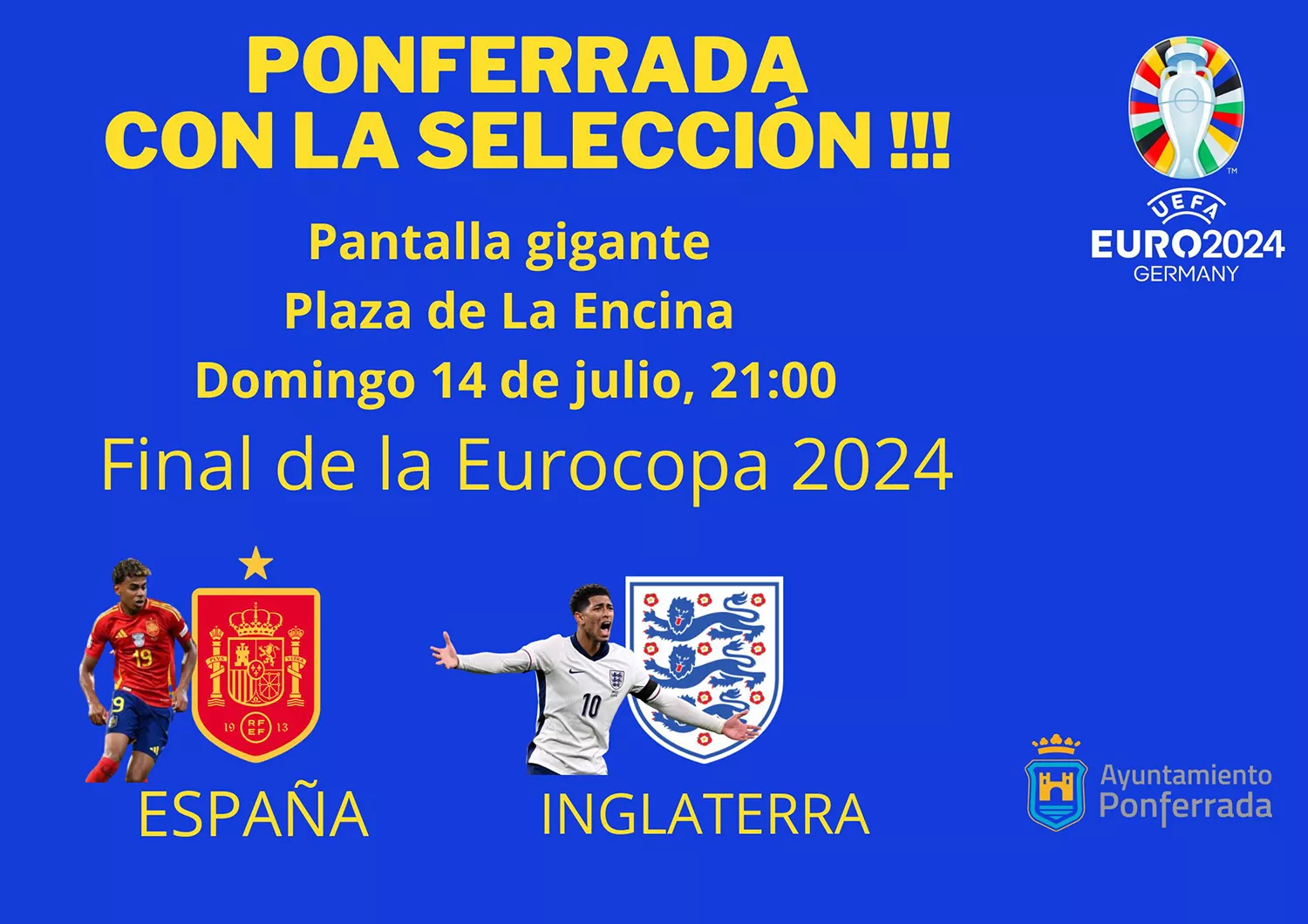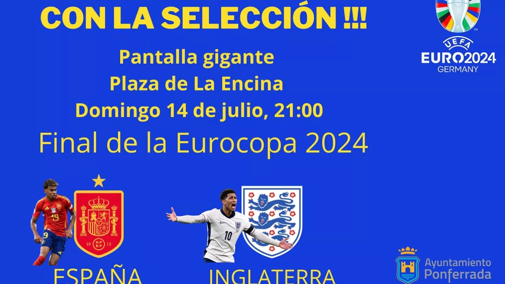El Ayuntamiento de Ponferrada anuncia la instalación de una pantalla gigante para este domingo, 14 de julio, con motivo de la final de la Eurocopa que enfrentará a la Selección Española de Fútbol contra la Inglesa a partir de las 21:00 horas. Su ubicación será la Plaza de La Encina.