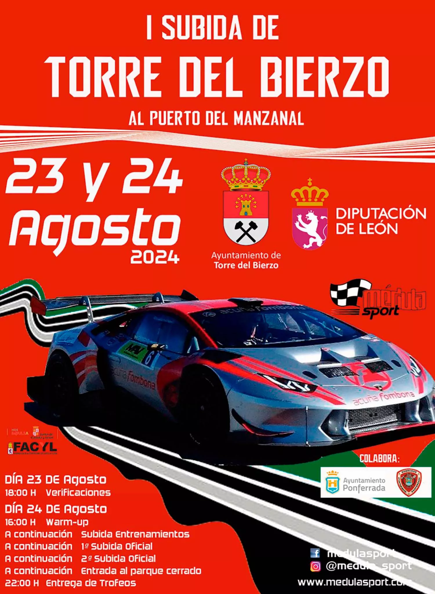 El próximo sábado 24 de agosto debuta, en el calendario del Campeonato de Castilla y León de Montaña, la I Subida de Torre del Bierzo al Alto del Manzanal. Médula Sport y el Ayuntamiento de Torre del Bierzo ponen en marcha esta prueba, largamente demandada por el automovilismo berciano, que discurrirá por el tramo de 4,4 kilómetros de la carretera LE-106 con salida en el kilómetro 4,5, a escasa distancia de la población de Torre del Bierzo, y meta en el kilómetro 0,15 antes de llegar al cruce con la actual N-VI.