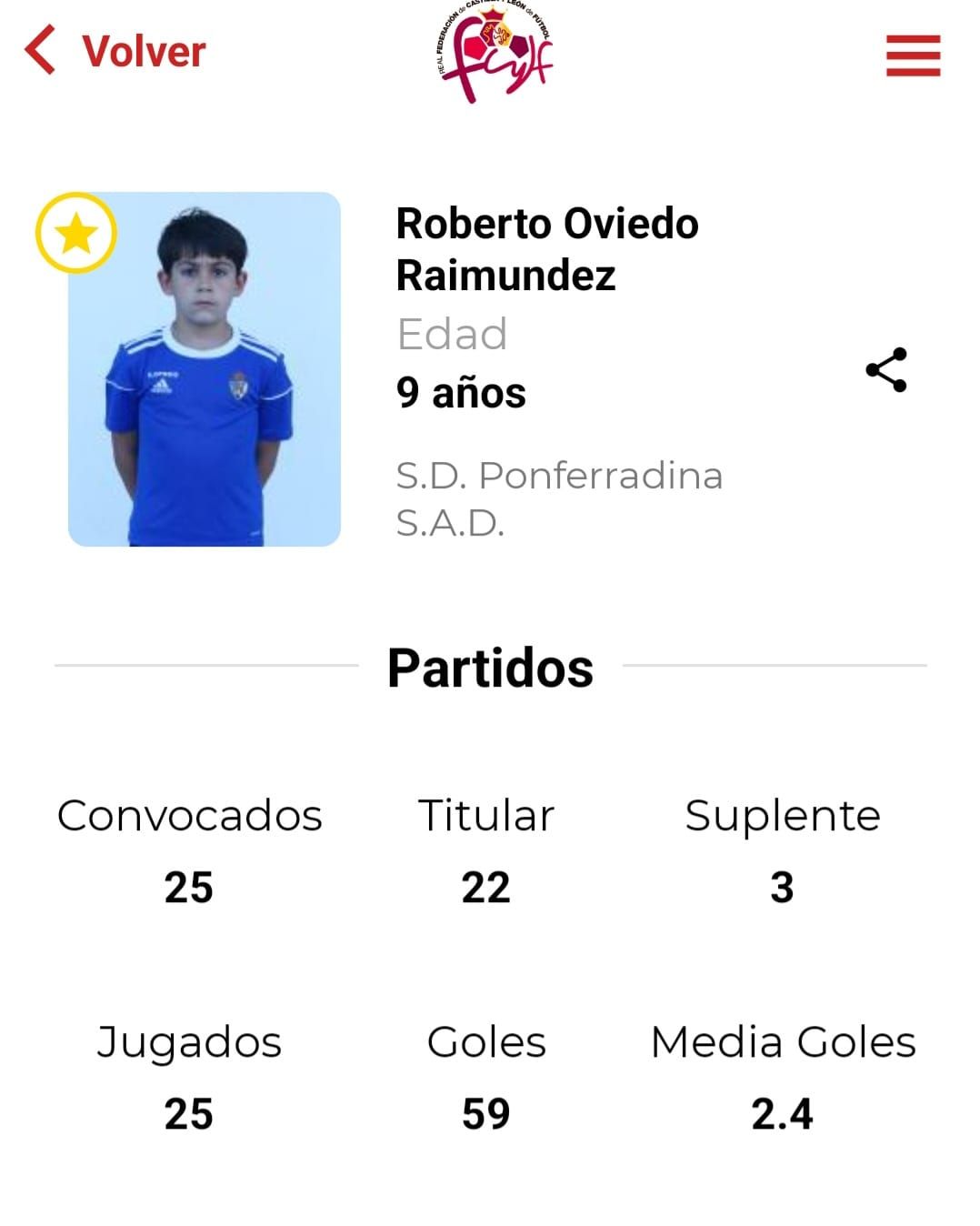 La historia de Roberto Oviedo podría ser la de muchos niños del Bierzo cuyo ídolo es Yuri, sin duda, el jugador más importante de la historia reciente de la Deportiva y quizá de sus 100 años. Sin embargo, la de este joven jugador de las categorías inferiores de la Deportiva Ponferradina es especial porque en la presente temporada tiene el mejor promedio goleador de las ligas provinciales de Castilla y León gracias a los 59 tantos que acumula en 22 partidos.