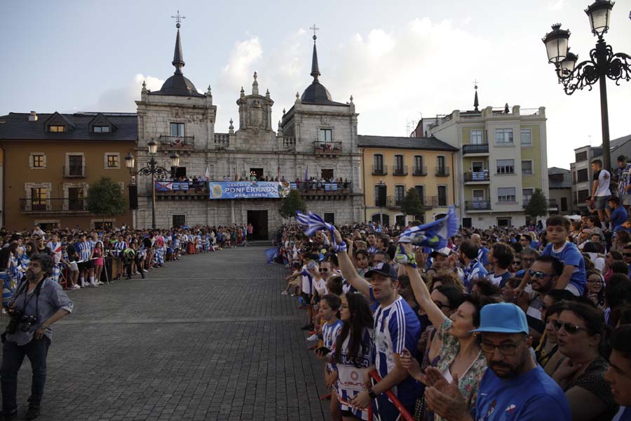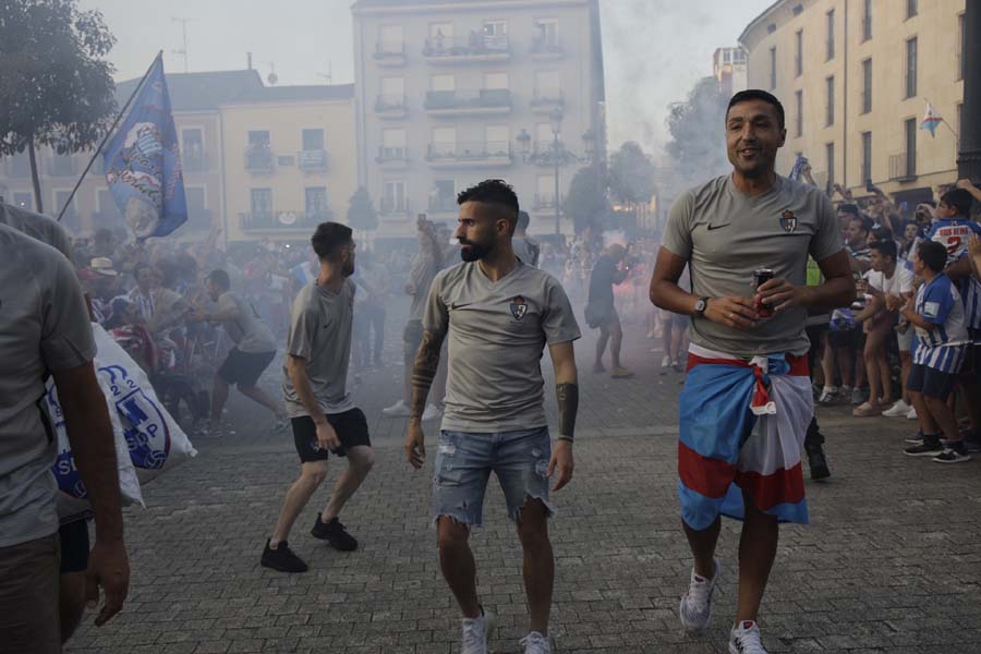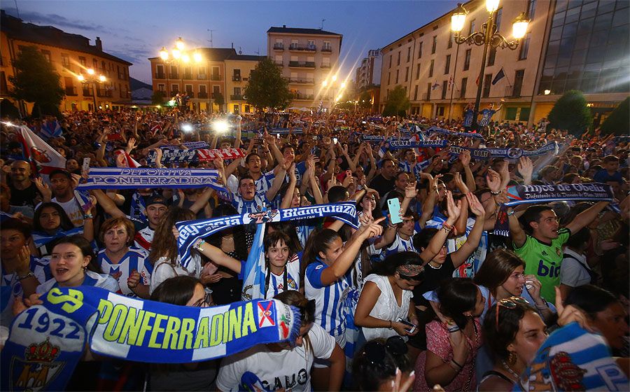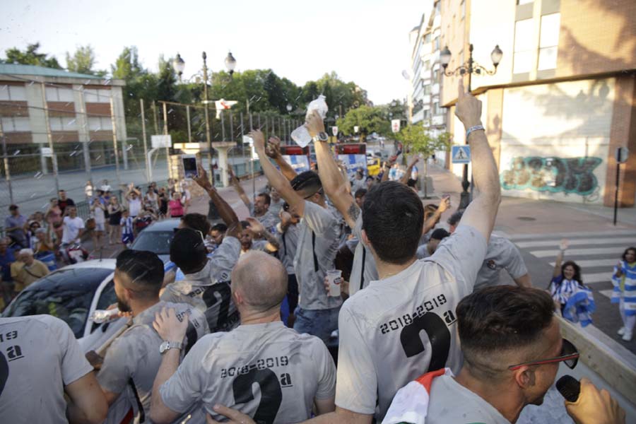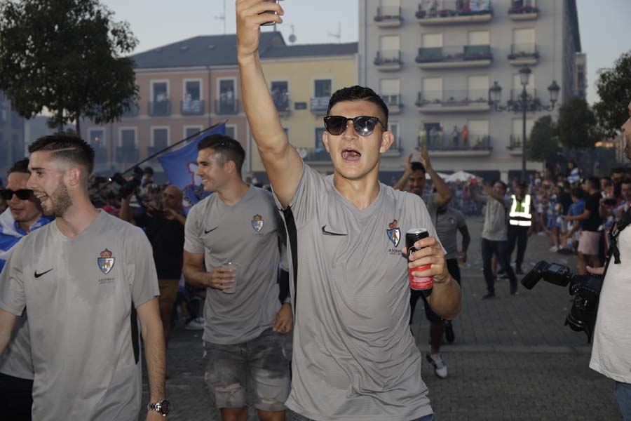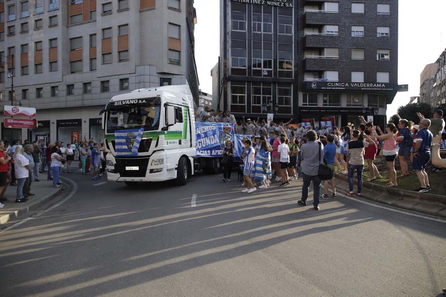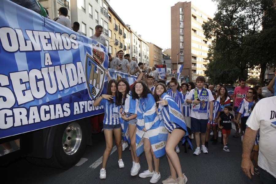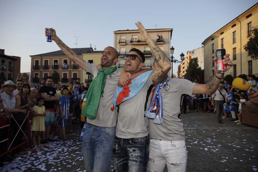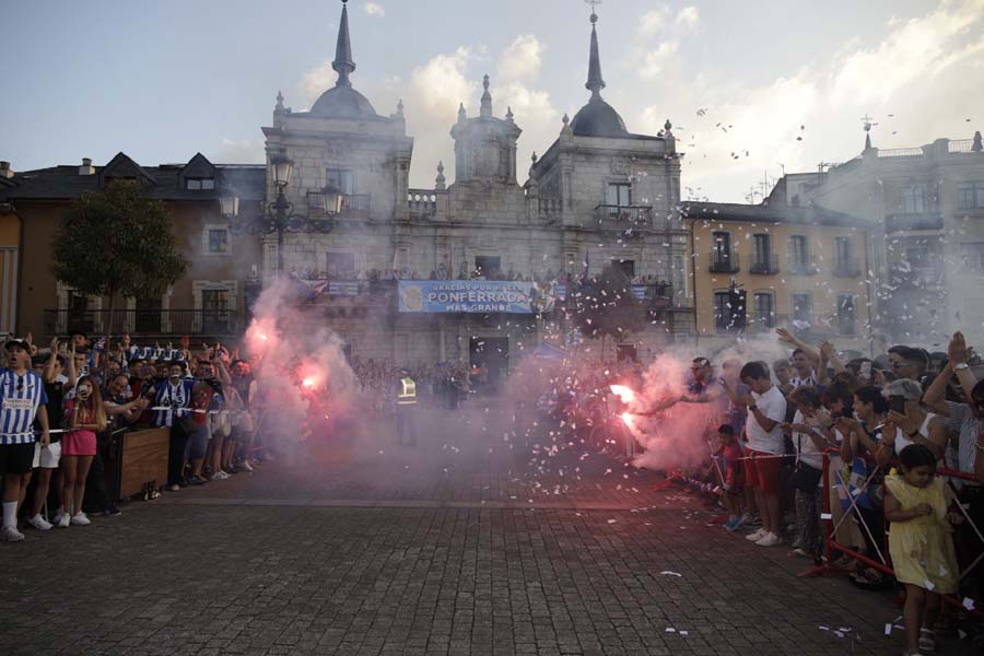 La Ponferradina salió del estadio El Toralín a las 19.30 horas dirigiéndose a la plaza del Ayuntamiento, donde los componentes del equipo realizarán una fiesta en el balcón, pasando antes por la plaza Lazúrtegui.