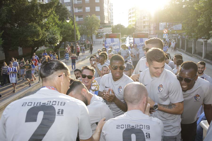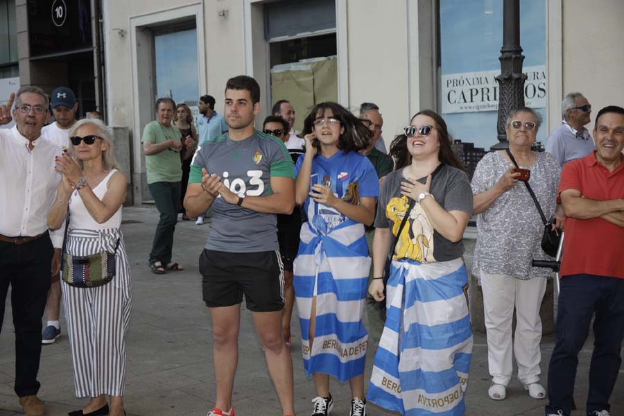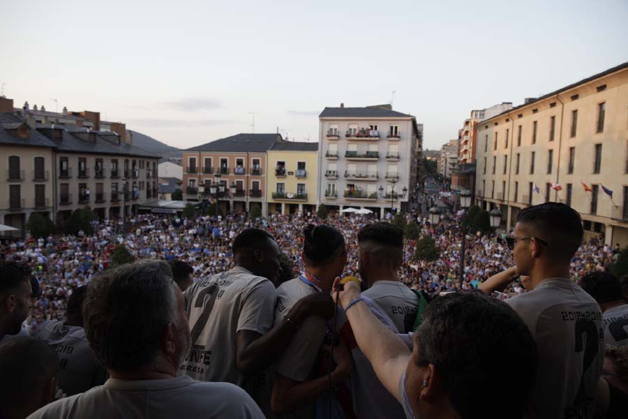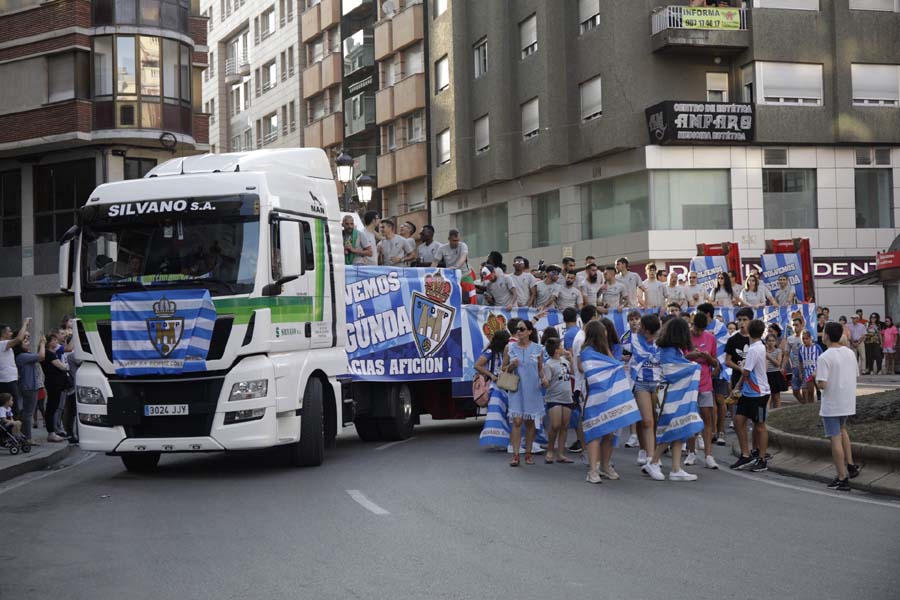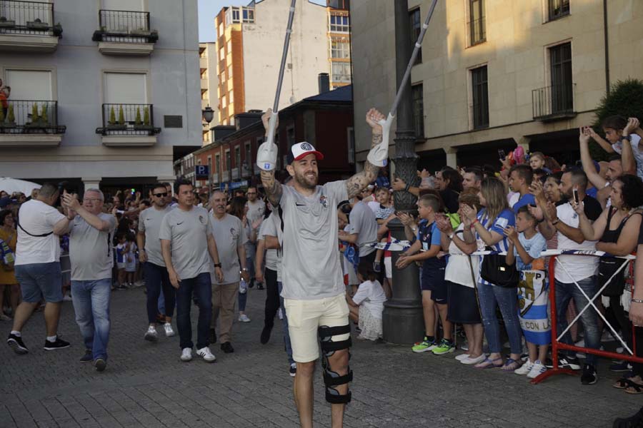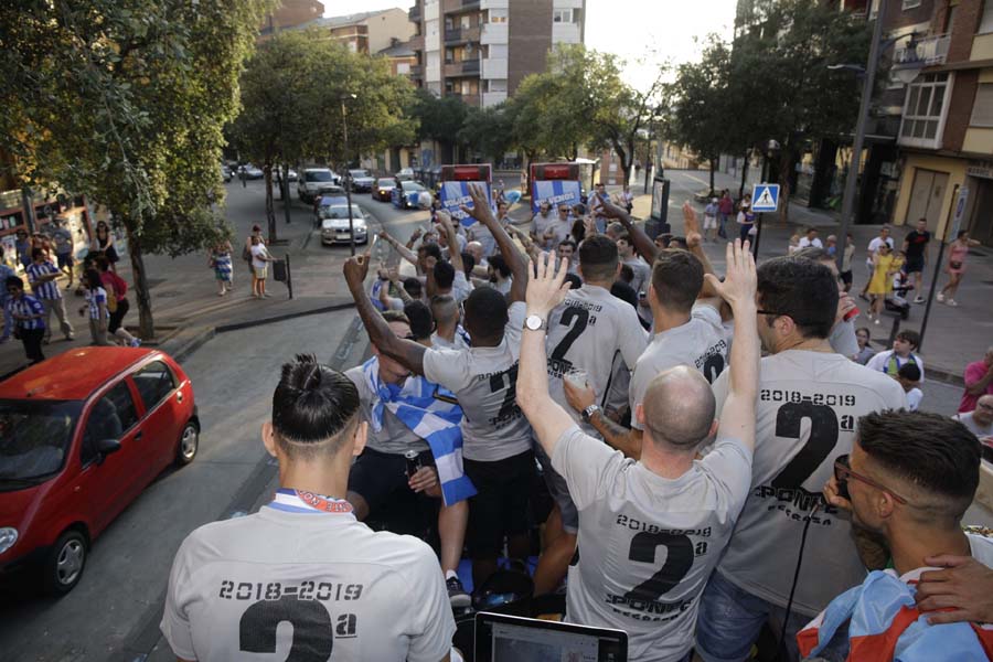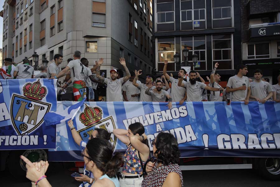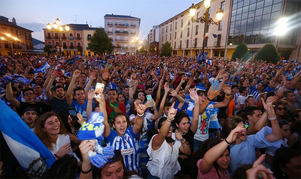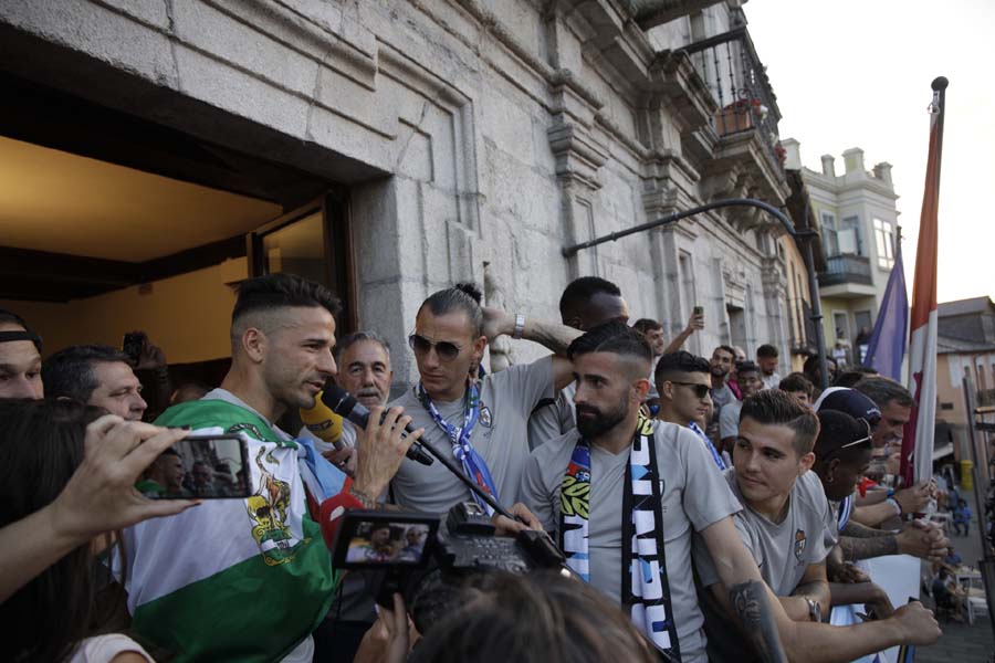 La Ponferradina salió del estadio El Toralín a las 19.30 horas dirigiéndose a la plaza del Ayuntamiento, donde los componentes del equipo realizarán una fiesta en el balcón, pasando antes por la plaza Lazúrtegui.