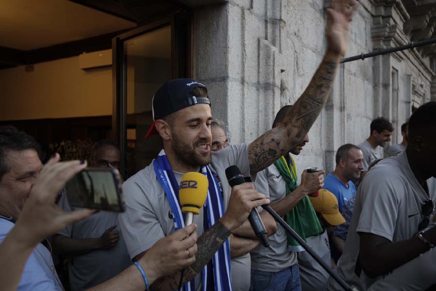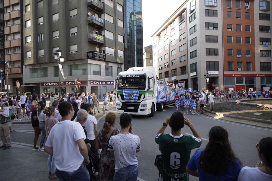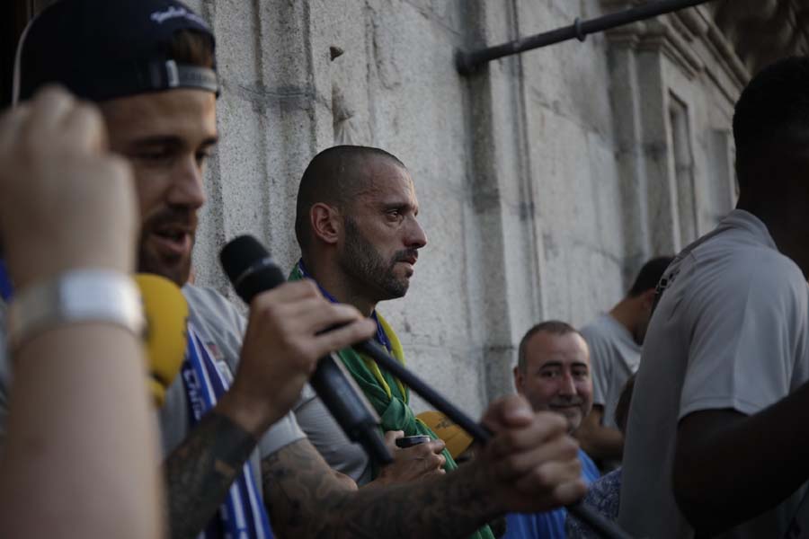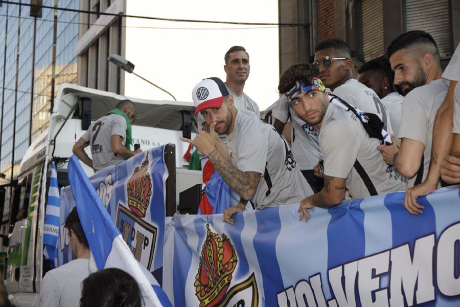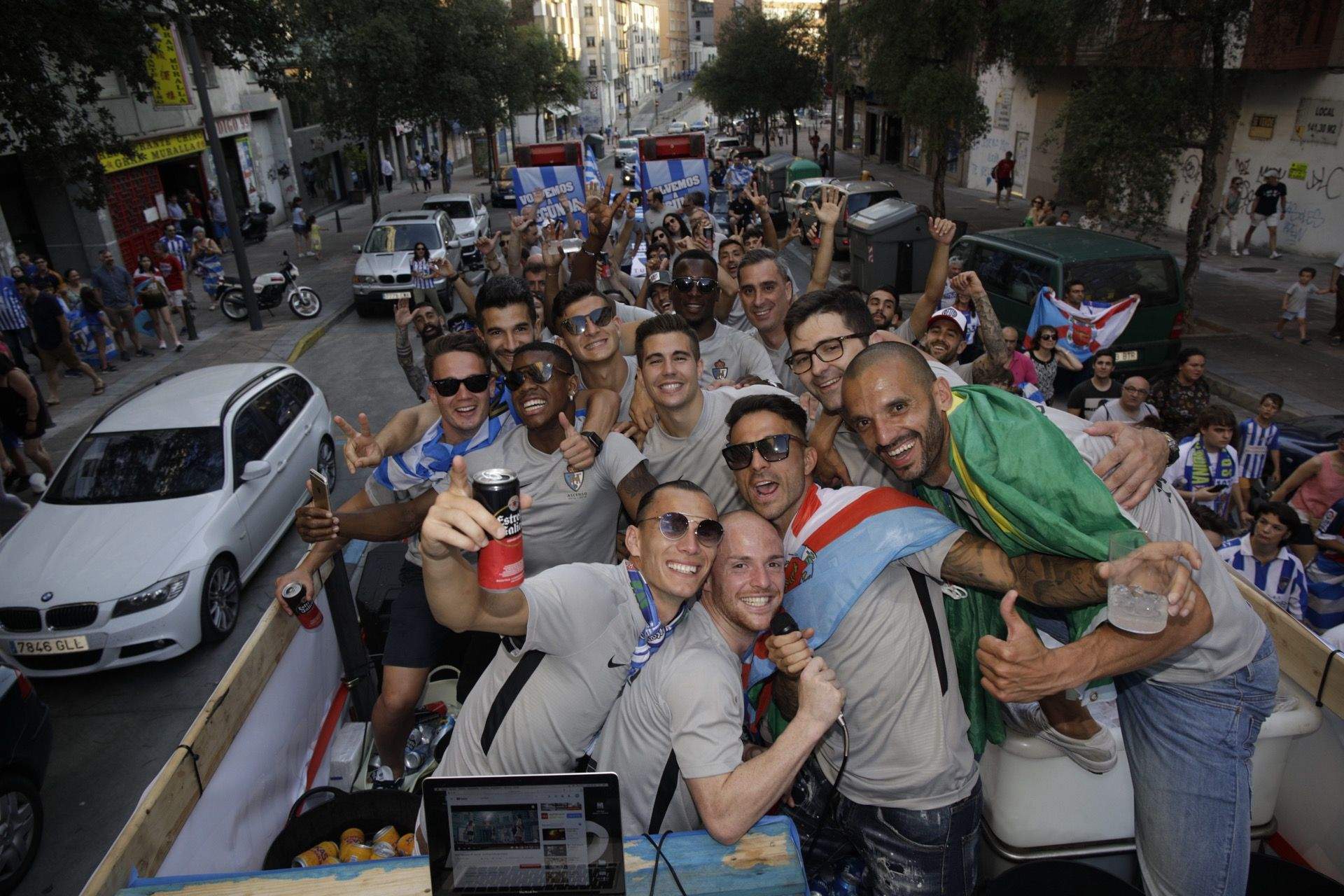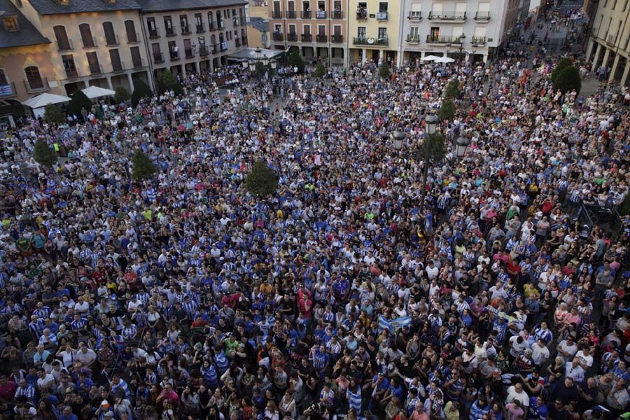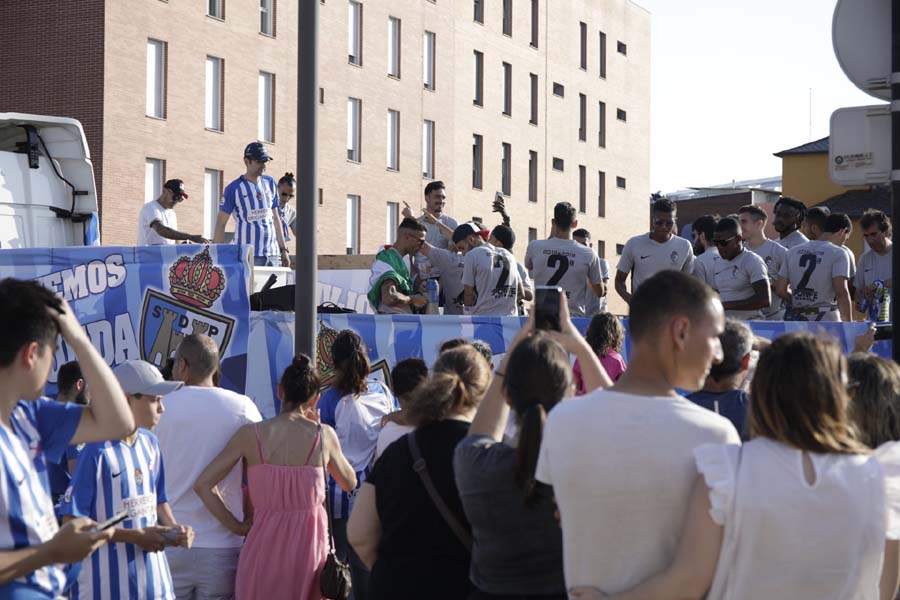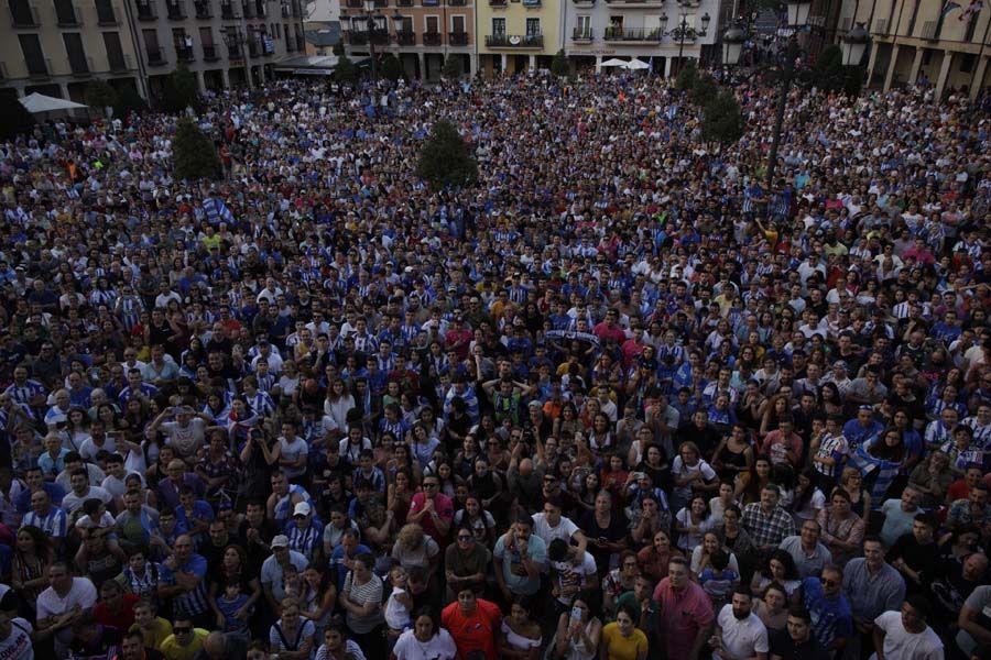 La Ponferradina salió del estadio El Toralín a las 19.30 horas dirigiéndose a la plaza del Ayuntamiento, donde los componentes del equipo realizarán una fiesta en el balcón, pasando antes por la plaza Lazúrtegui.