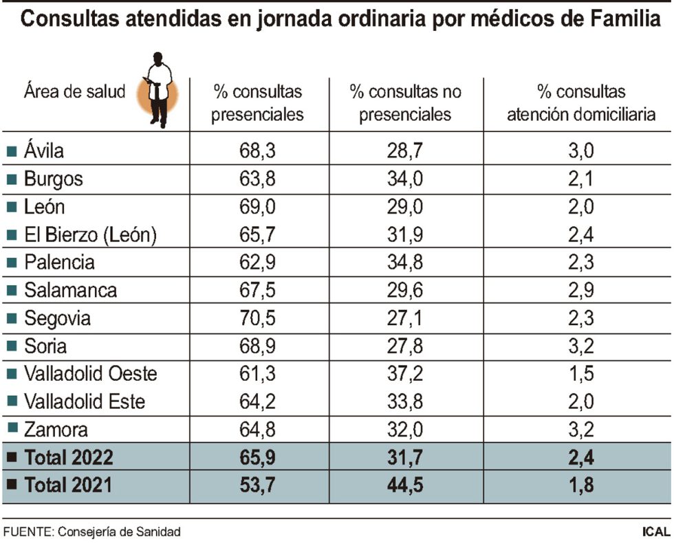 Mientras, en la zona de Valladolid Oeste, las consultas presenciales representaron un 61,28 por ciento, la cifra más baja del global autonómico, aunque partía de un 45,63 por ciento. Palencia también obtuvo datos inferiores a la media autonómica, un 62,87 por ciento, pero subió de manera importante desde el 49,48 por ciento, al igual que la de Burgos, que evolucionó de un 52,43 por ciento, a un 63,82.