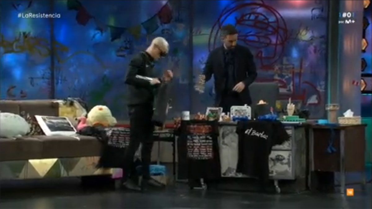 Tanto los colaboradores, como Broncano reconocieron el nombre de John Pollon en las camisetas e incluso bromearon sobre él -como es lógico al ser su profesión- haciendo comentario sobre "el brazo" del músico.