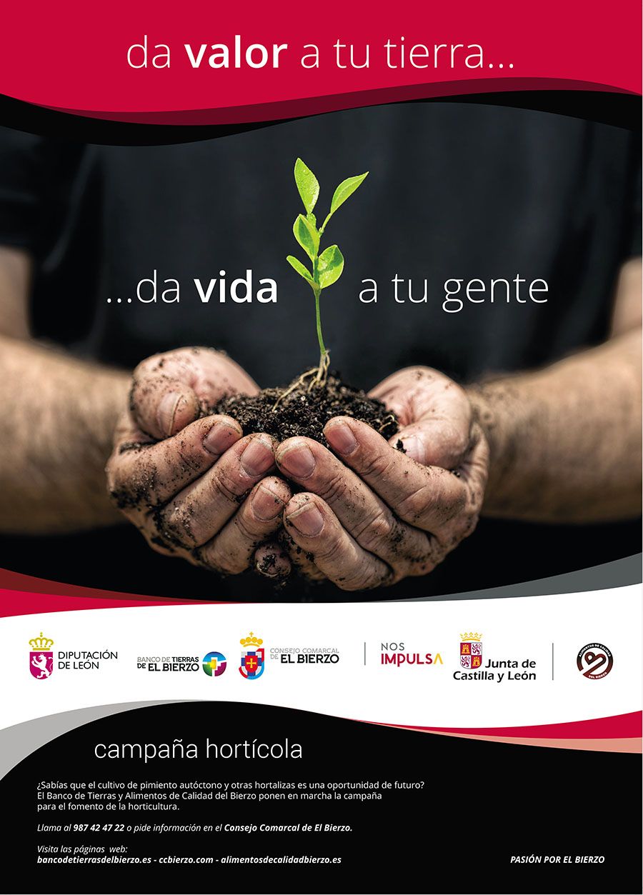 Foto: Cartel campaña 'Da valor a tu tierra, da vida a tu gente' / Consejo Comarcal del BierzoLa campaña 'Da valor a tu tierra, da vida a tu gente' presentada este viernes trata de incentivar la incorporación de nuevos emprendedores, la captación de fincas abandonadas aptas para el cultivo, la cesión de arrendamiento y la venta de estas parcelas a través del Banco de Tierras. Además de proporcionar formación para aumentar la cualificación en el sector agrario.