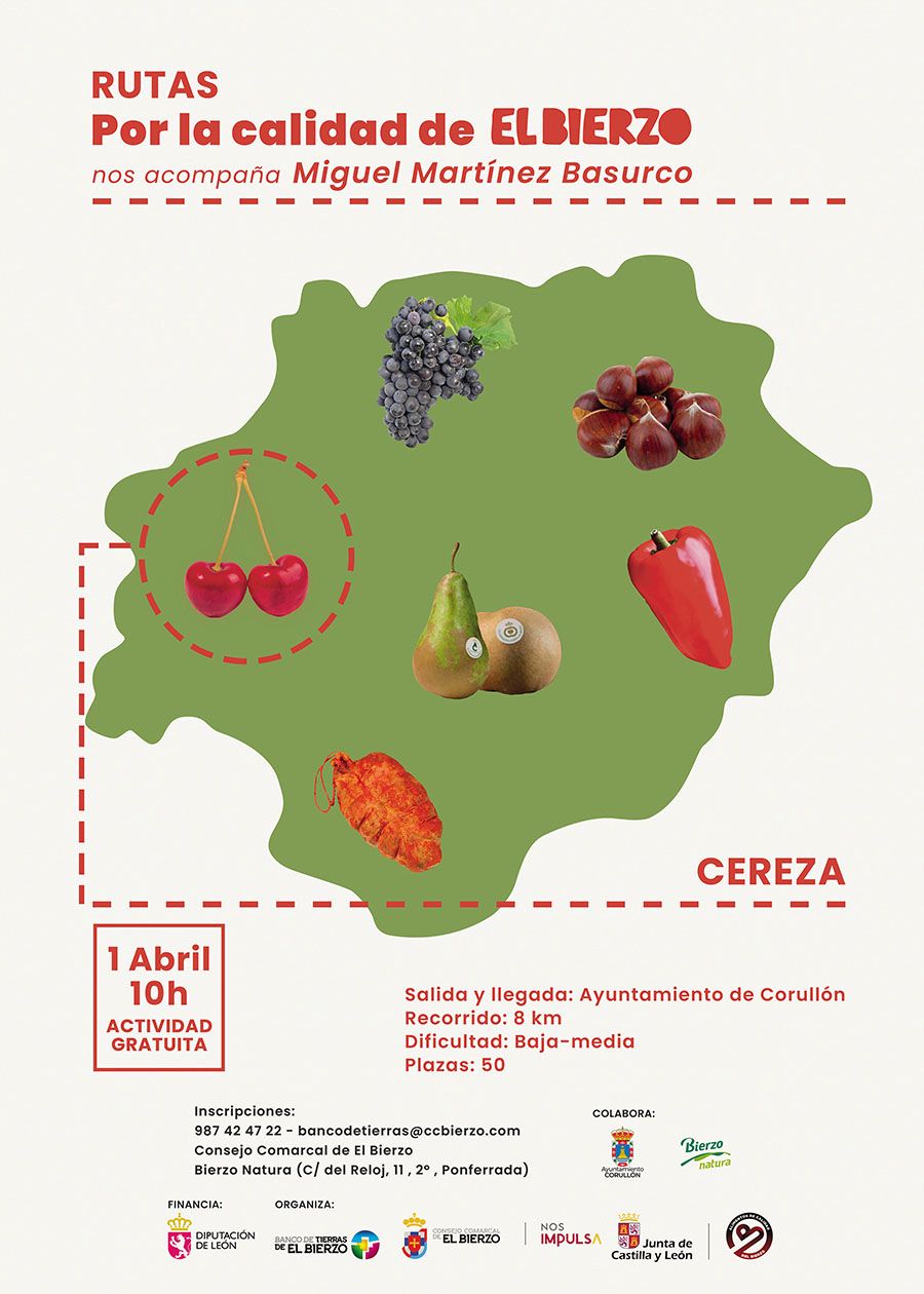 Foto: Cartel Ruta por la calidad del Bierzo / Consejo Comarcal del BierzoCourel ha anunciado que como novedad una personalidad relevante del Bierzo acompañará a todo el que asista a esta ruta. En la Ruta de la Cereza "contaremos con la compañía del atleta Miguel Martínez Basurco, ultra fondista, campeón de España y conocido por diferentes actividades y pruebas, además de ser un apasionado del Bierzo y de sus productos", ha señalado el presidente del Consejo Comarcal.