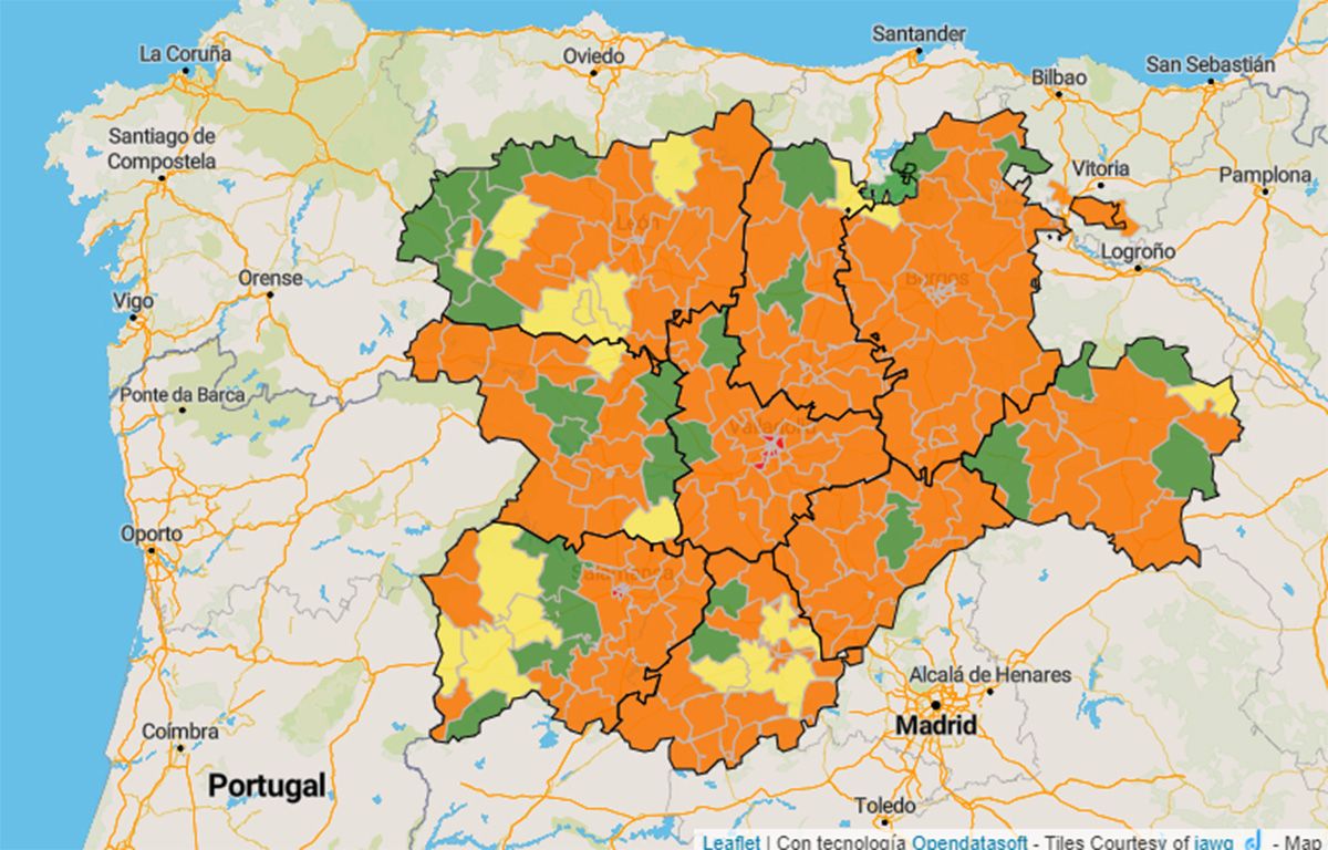 Muñico y Fontiveros, en Ávila; Valle de Losa y Valle de Valdebezana, en Burgos; Truchas, Puente Domingo Florez, Villafranca del Bierzo, Ponferada I, Cacabelos, Fabero, Toreno, Villablino y San Emiliano, en León; Carrión de los Condes y Cervera de Pisuerga, en Palencia, son las áreas en verde en estas provincias.