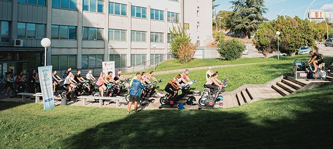 El exterior del edificio principal del Campus de Ponferrada de la Universidad de León (ULE) celebró en la tarde de ayer martes 27 de septiembre la ‘II Master Class de Spinning’, que fue organizada en colaboración con el Centro Quality de Ponferrada, con motivo del inicio de curso y el arranque de temporada.