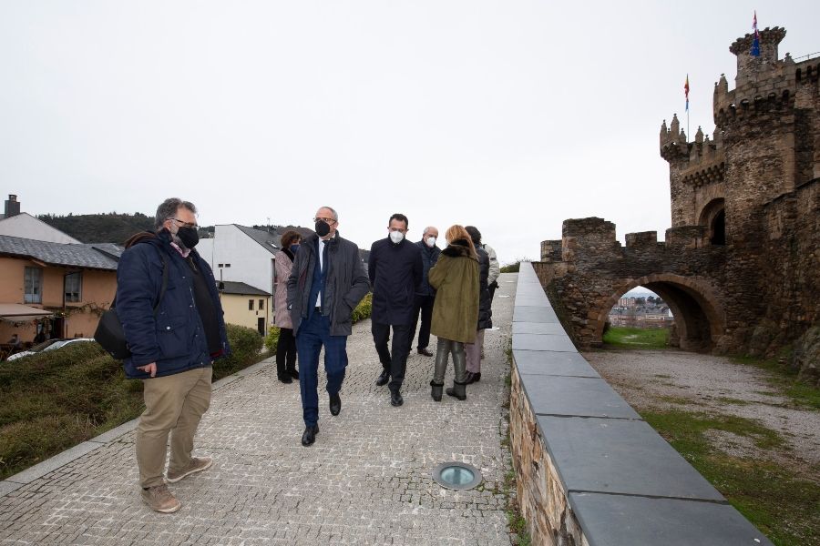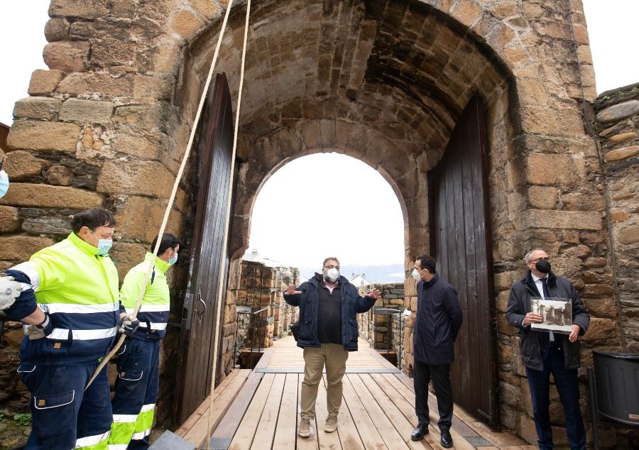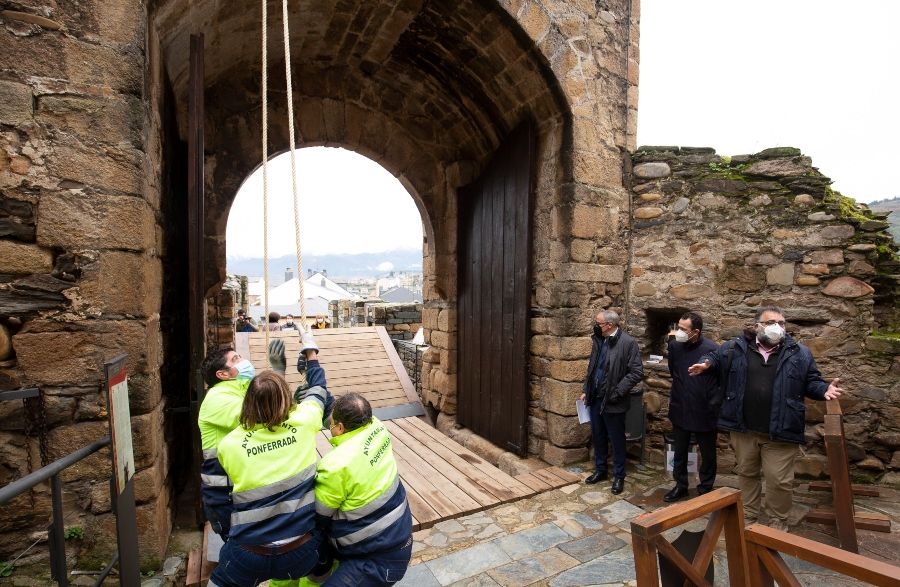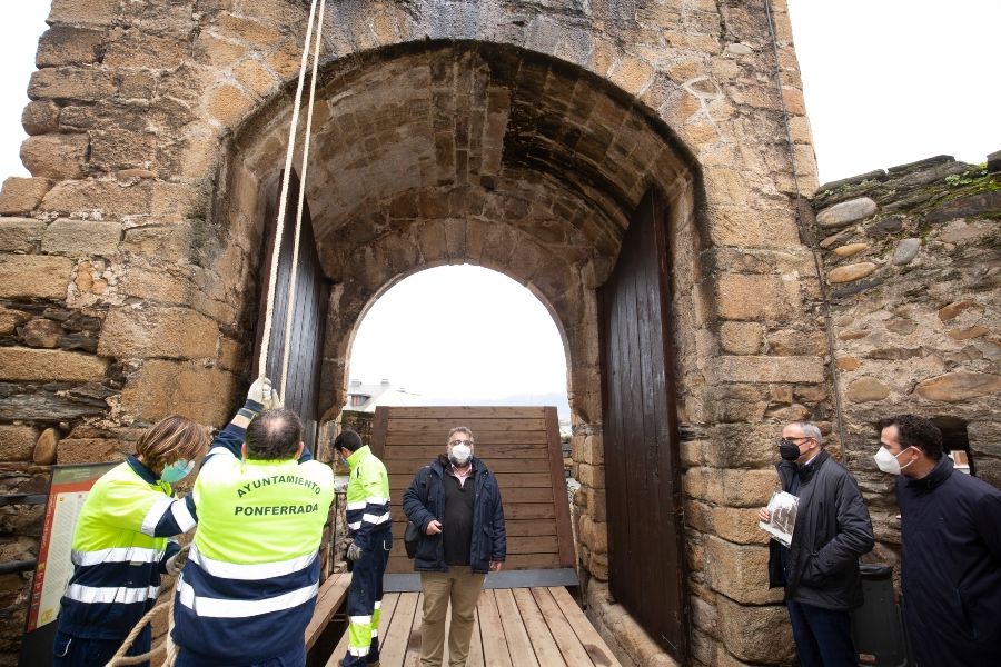 Fotos: César Sánchez / ICALEl Castillo de los Templarios de Ponferrada vuelve a tener puente levadizo tras la finalización de las obras de reforma en el acceso a la fortaleza, adjudicadas a la empresa Trycsa por 65.800 euros procedentes de los remanentes de tesorería de anteriores ejercicios. El alcalde de la ciudad, Olegario Ramón, y el arquitecto director de los trabajos, Fernando Cobos, visitaron este jueves los trabajos y asistieron al primer alzado de la nueva estructura.