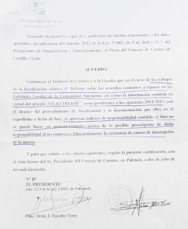 Según el documento al que ha tenido acceso Infobierzo, el Consejo detectó estas irregularidades durante la fiscalización que realiza del 'Informe sobre los acuerdos contrarios a reparos de las Entidades Locales de la Comunidad Autónoma", relativo a los ejercicios 2014-2015, al que el equipo de gobierno municipal presentó alegaciones junto a la documentación justificativa de la ejecución de los avales del Mundial. "Con el alcance del procedimiento fiscalizador y la documentación que obra en el expediente a fecha de hoy se aprecian indicios de responsabilidad contable", recoge la certificación del Consejo de Cuentas, fechada del pasado 2 de julio y de la que se acaba de dar traslado.