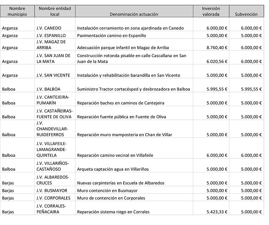 Al respecto, las actuaciones cuentan en todos los casos con presupuestos de entre 5.000 y 7.000 euros y se orientan hacia pequeñas obras de pavimentación o mejora de los pueblos. El plazo para la ejecución y justificación de estas actuaciones finaliza el 30 de junio y los beneficiarios deberán comunicar al servicio técnico del Servicio de Asistencia a Municipios (SAM) la fecha de inicio de las obras para que se gire la visita previa preceptiva.